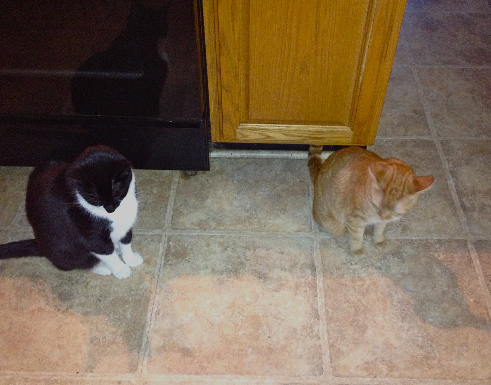 So I wished him well, told him to be careful and “love you(ed)” him out the door and snuggled back down into my heated mattress pad blanket cave. Thankfully, my cell phone vibrate-buzz woke me at 8:45 an undisclosed time and my body screamed for VERONA as the kitties were screaming for their breakfast treat (a small spoonful of canned cat food in their bowl before a day of dry cat food. Here they are waiting patiently. Our routine is momma gets the coffee brewing first…then they can have their treat. Jack, our Golden, gets to lick the spoon.