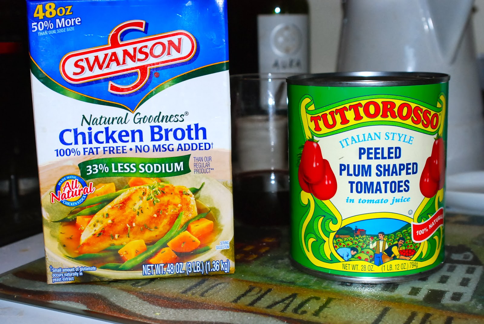 Pour in a large container of chicken broth. Or water and chicken bullion or base. Or vegetable broth. Whatever you have. I used one large container of low sodium chicken broth at this point. Open a can of tomatoes. This is a big can. Which is exactly what I asked my people to buy for me at the grocer this morning. I only used half a can. I dumped in about half of the tomatoes and half of the liquid. I cut into the tomatoes once they were in the broth to release all of the juicy yumminess inside and to make bite-size pieces.