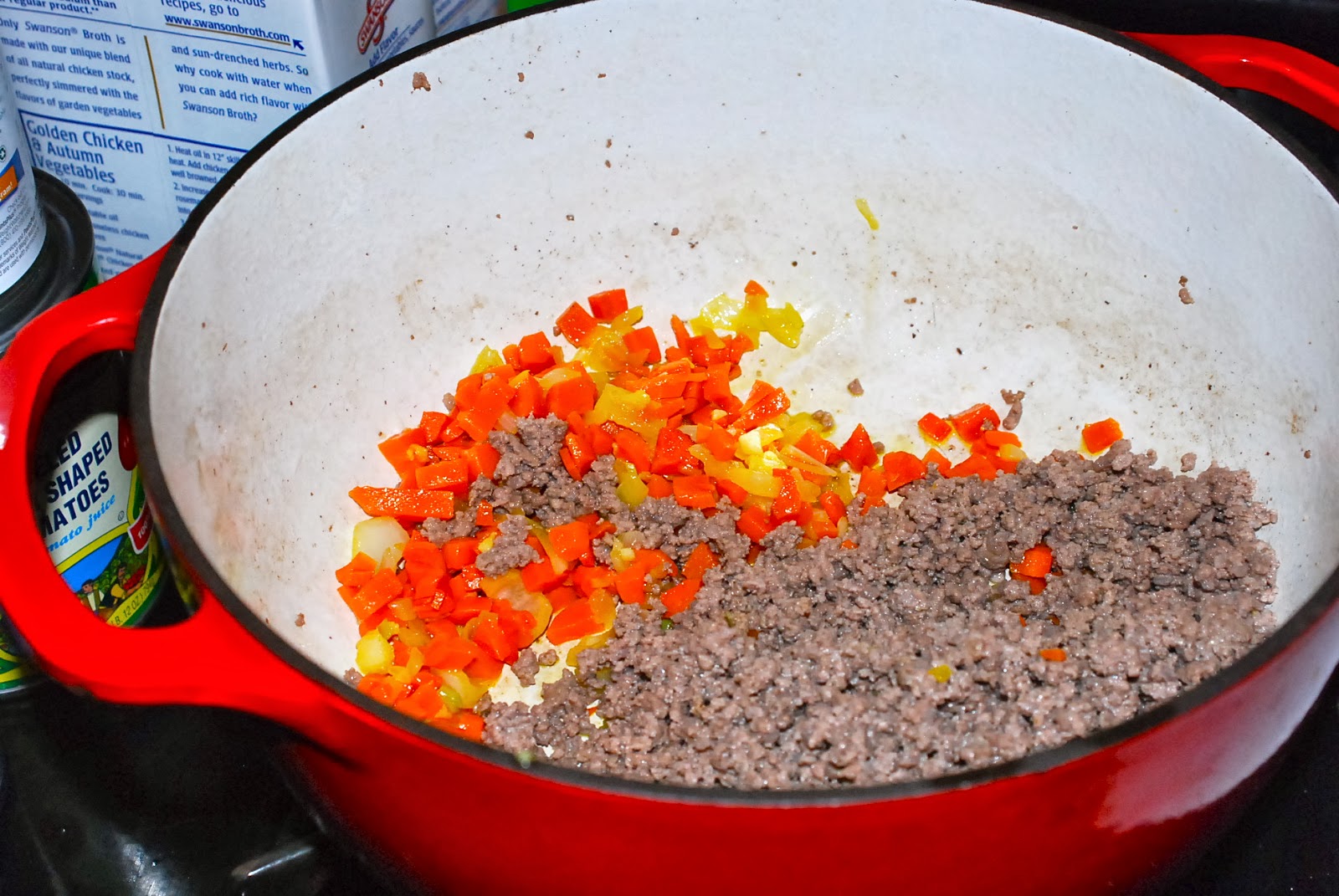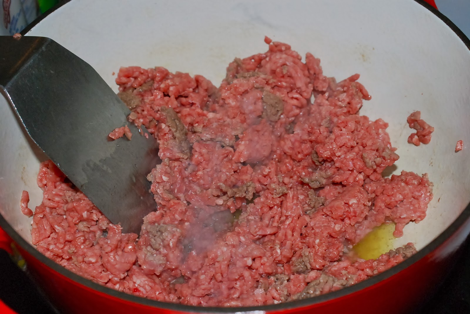After you let the meat drain a minute, add the meat and the carrot/onion/garlic mixture into your stock pot, assuming you can find where your children hid it when they emptied the dishwasher/washed up the pots and pans and put them away. Otherwise, you can use your braising pan, like I was forced to do.