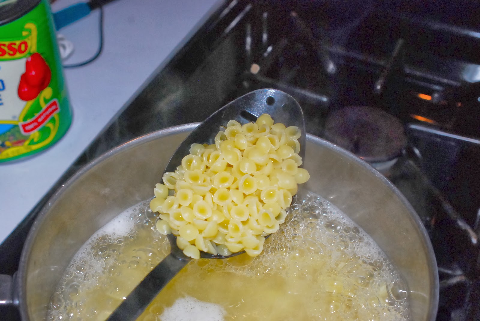 Heat up a saucepan of water and once the water is boiling, cook some pasta. This is what I used. I have never seen them before. Mom sent them home with me yesterday. She sent home a couple of bags of goodies. There were two packages of these. Love. Them. Cook them right up, according to the instructions on the package. You can use any small pasta. But, in times of desperation, we have been known to use penne or rigatoni.