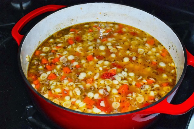 That is how the recipe was given to me by a sweet friend I worked with at The Firm many years ago. She has gone on to be with Jesus now, but she was the real-deal Italian and told me this was her momma’s exact recipe, then her recipe and now mine. Please note that by definition, pasta fagioli means “pasta and beans” and originated as a peasant meal that did not include meat. Ellen told me her momma added whatever meat they had that she wanted to use up. I always make ours with ground beef because that is how my people like it.